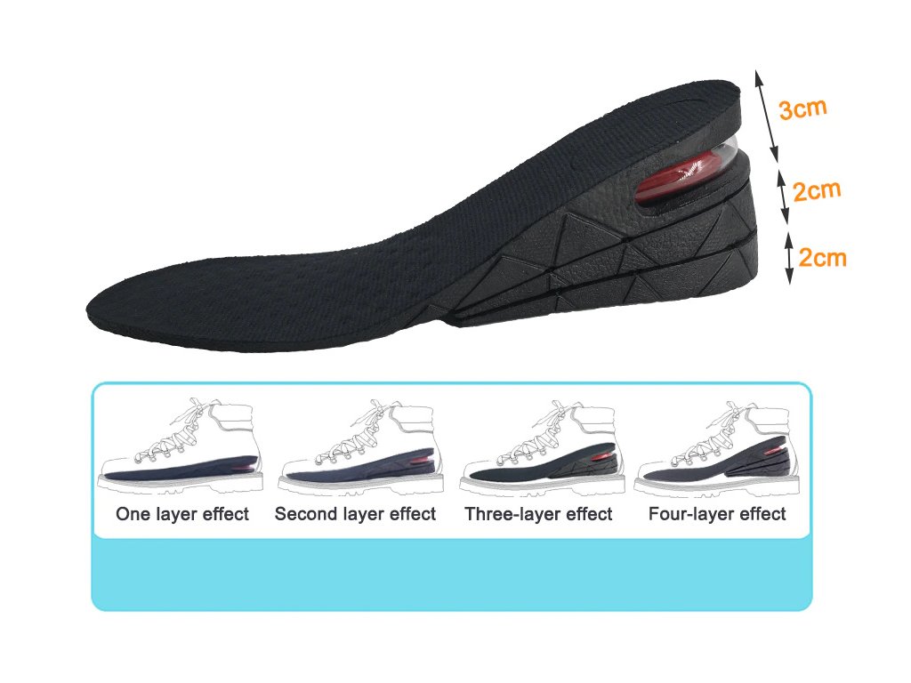 Jastučići za povećanje iznimno su fleksibilni i izdržljivi. Prikladne su i za muškarce i za žene. Prilagođavaju se svima. Prikladne su za različite vrste cipela. Paket sadrži dva komada uložaka - po jedan za svako stopalo. U stražnjem dijelu uloška nalazi se zračni jastuk koji ublažava mikroudare uzrokovane hodanjem i time smanjuje opterećenje zglobova, koljena i kralježnice.