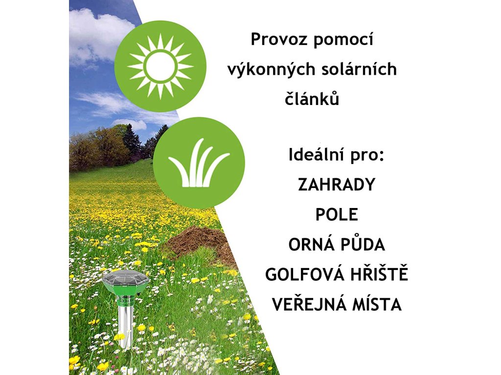 Primjena ovog solarnog repelenta iznimno je široka. Možete ga koristiti u borbi protiv zmija, mrava, krtica, miševa, štakora i ostalih glodavaca. Učinkovit je i protiv kuna ili ptica do 10 m. Idealno za zaštitu vaših usjeva. Sve te životinje osjetljive su na niz vibracija s promjenjivom frekvencijom od 400 do 1000 Hz. Istraživanja su potvrdila učinkovitost uređaja na površini do 1000 m2.