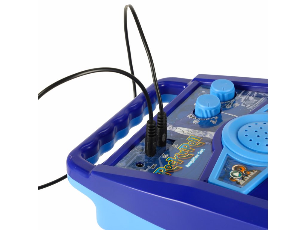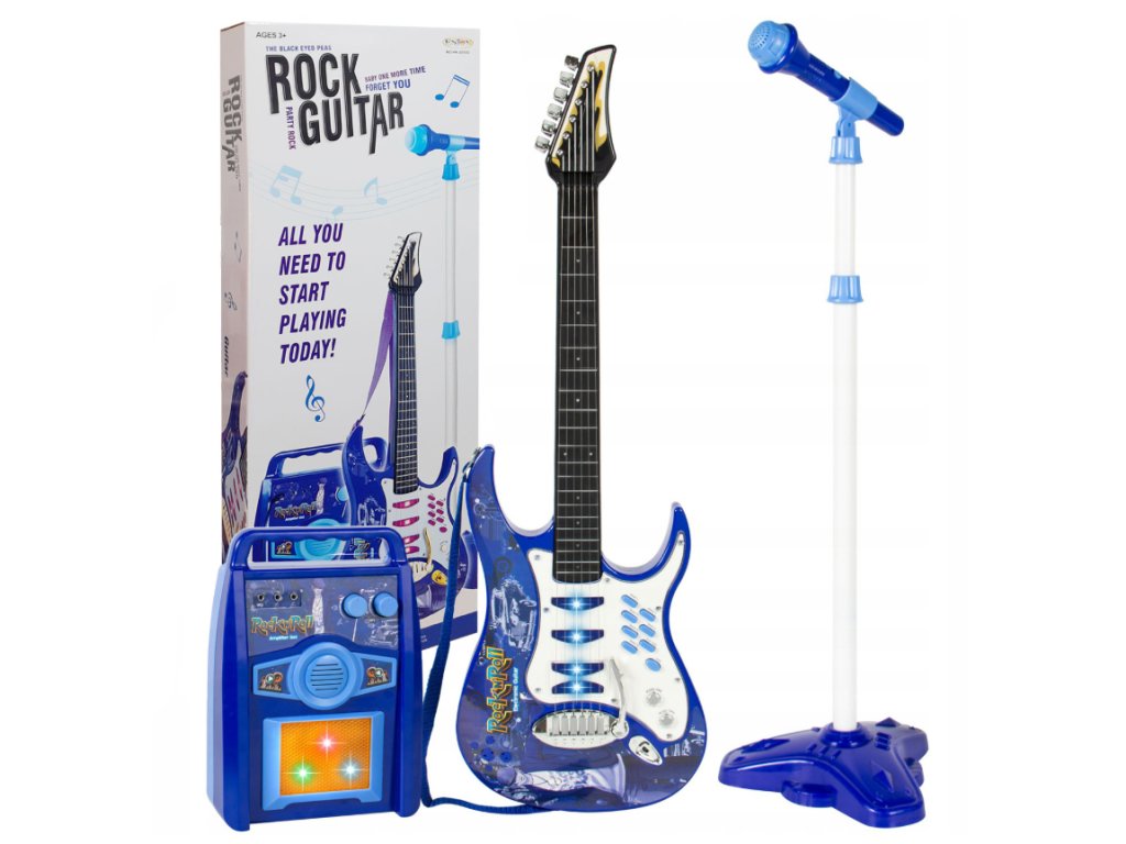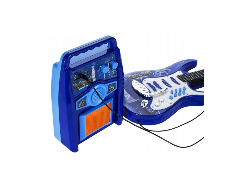 Za još bolji glazbeni doživljaj, paket također uključuje pojačalo i mikrofon sa stalkom. Pojačalo i gitara su napaja se s tri AA baterije (nije uključeno) a mikrofon i gitara su spojeni na pojačalo pomoću kabela (uključeno). Podesiva visina stalka omogućuje vam prilagođavanje seta djetetovoj visini. Igračka podržava razvoj fine motorike , glazbeni sluh i kreativnost djece.