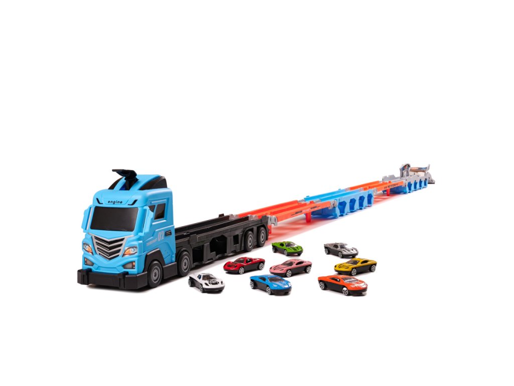 Kada se rasklopi, kamion se pretvara u impresivnu trkaću stazu dugu 210 cm, nudeći obilje prostora za uzbudljive utrke s više vozila. Djeca mogu izgraditi vlastitu stazu i uživati u natjecanju kad god požele.