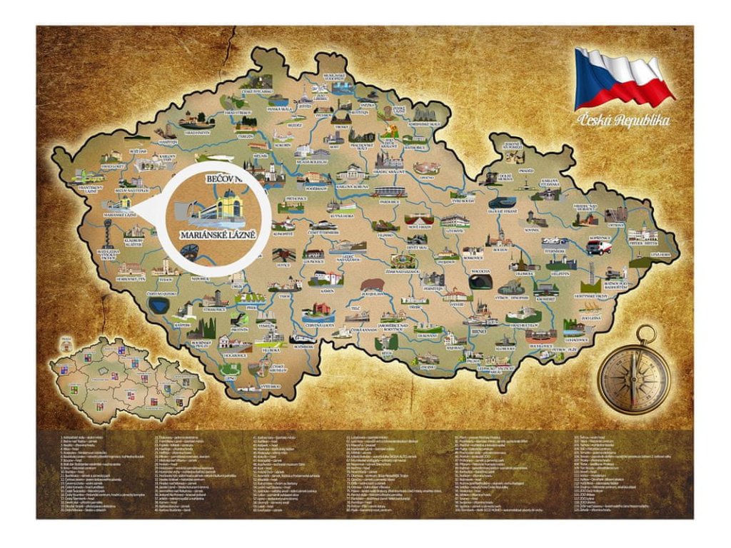 Stírací mapa Česka je velmi originální mapa pokrytá hliníkovou fólií, kterou stačí jen setřít předmětem s hrubým povrchem a vzápětí se Vám odhalí barevné vyobrazení zemí. Takto si můžete na mapě vyznačovat místa, která jste již navštívili nebo místa, která byste si přáli vidět.