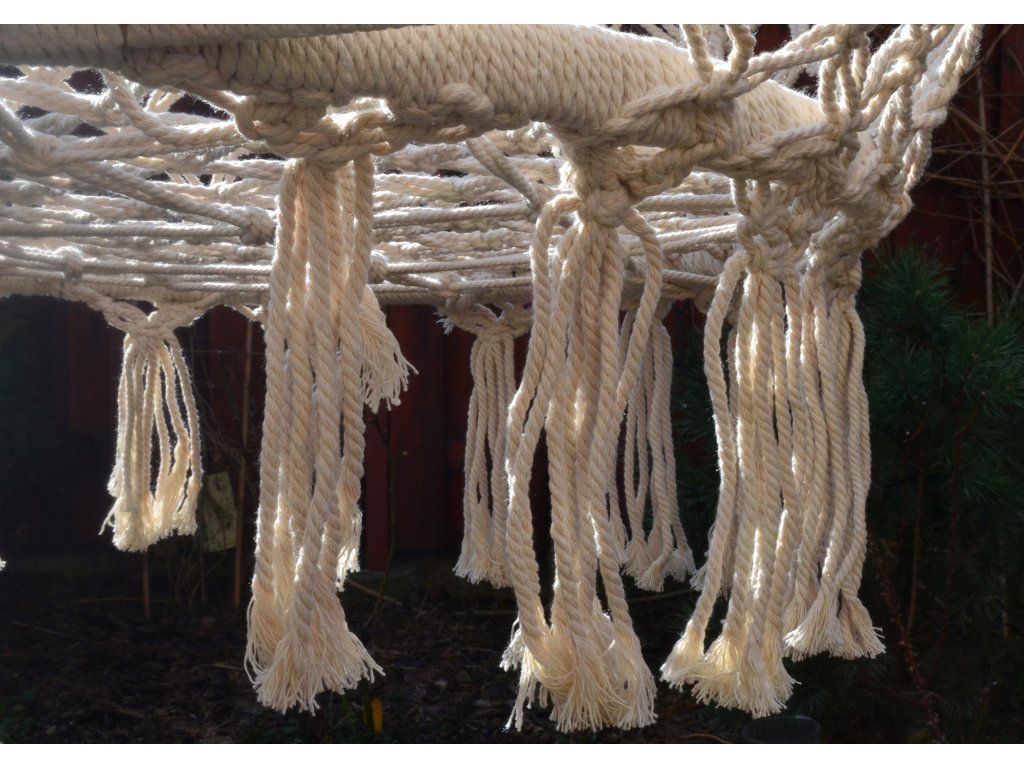 Viseća stolica spremna je za svakodnevnu i dugotrajnu upotrebu bez kompromisa. Čvrsta pamučna užad i metalni okvir pružaju impresivnu nosivost, tako da možete uživati u bezbrižnim trenucima kad god vam zatrebaju.