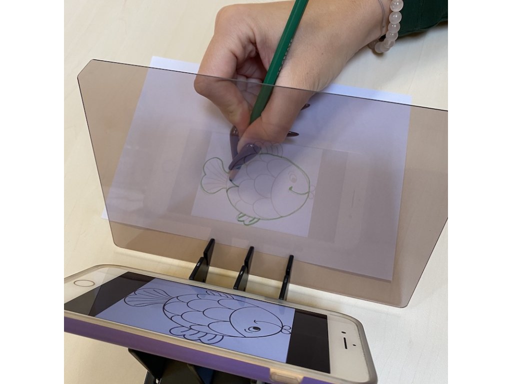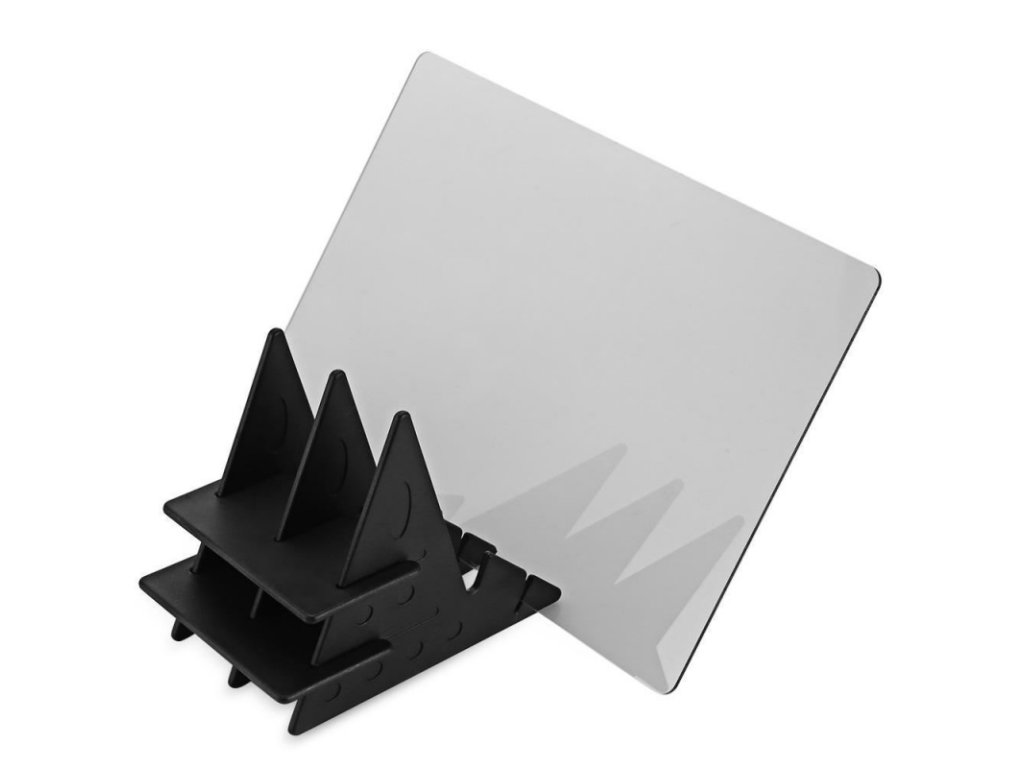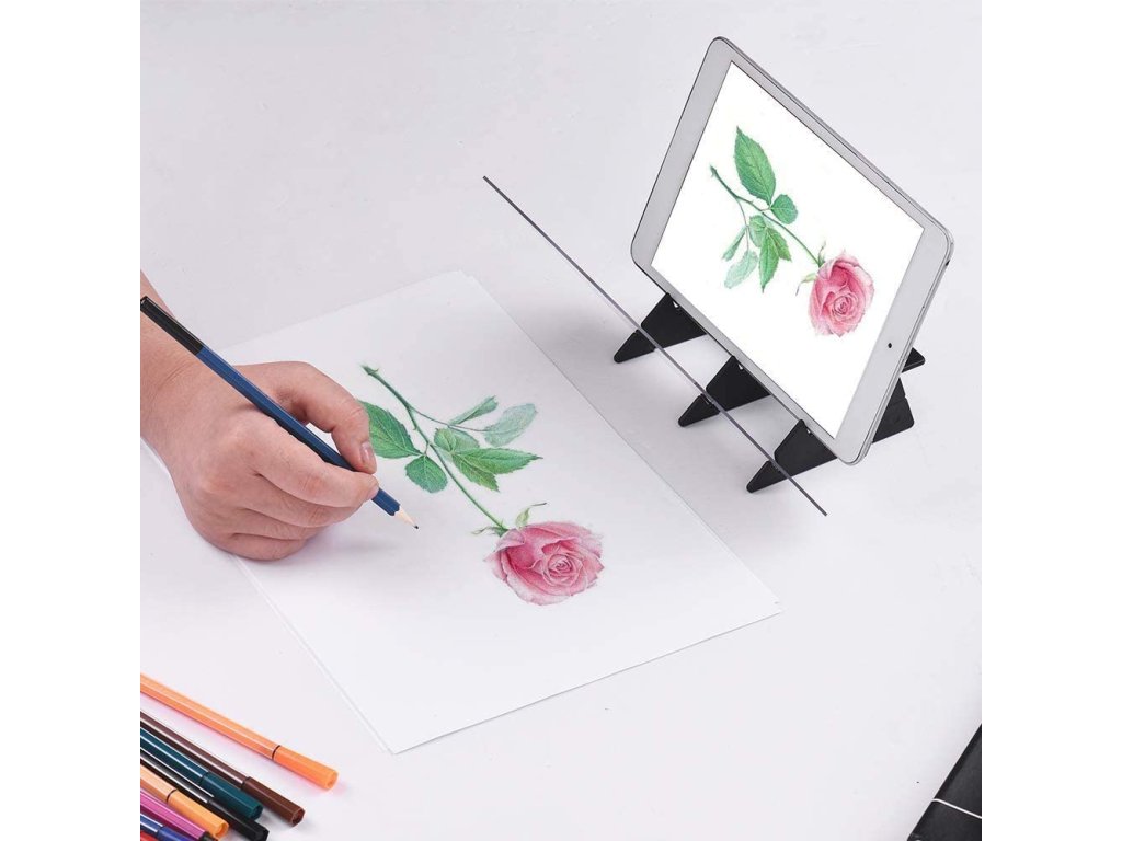 Za korištenje vam nije potrebna struja ili bilo kakva lampa. Sve što trebate učiniti je sastaviti postolje, skinuti zaštitnu foliju sa stola i umetnuti je u utore na kraju stalka. Postavite uređaj s kojeg ćete pratiti sliku tako da se slika odbija od stola. Slika se zrcali na papiru. Za bolju vidljivost povećajte svjetlinu svog telefona ili tableta.