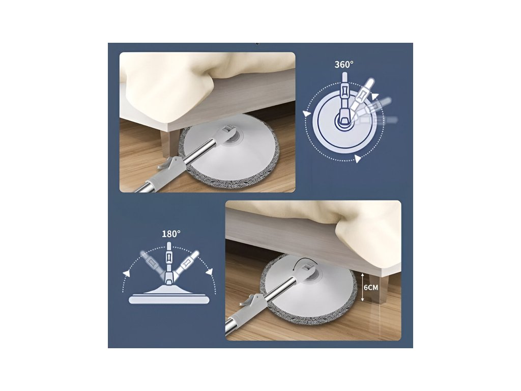 Jedinstveni mop s rotirajućom glavom bez napora se prilagođava svakom pokretu zahvaljujući potpunoj rotaciji od 360°. Možete udobno dosegnuti ispod sofa, ormarića ili stolova bez nepotrebnog saginjanja.