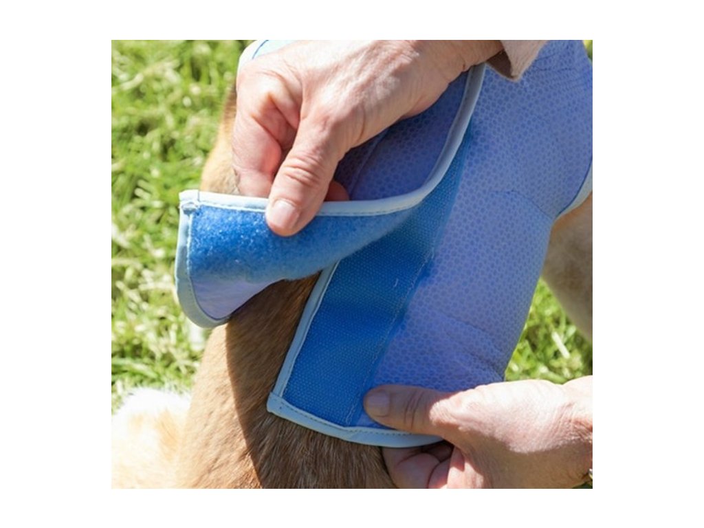 Korištenje rashladnog prsluka je potpuno jednostavno. Stavljate ga na psa tako da mu dio za pričvršćivanje bude na leđima. Nakon toga prsluk navlažite čistom vodom. On će ga upiti i obavljati funkciju hlađenja.