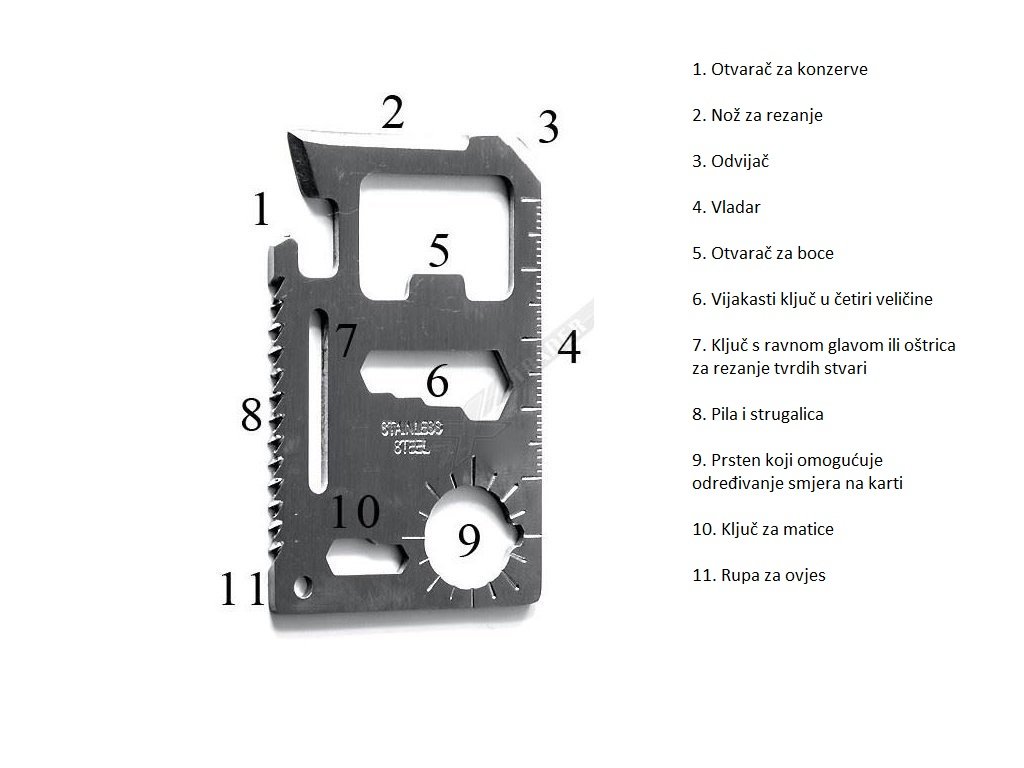- Na kartě najdete: klíč na matky, klíč na šrouby 6,7,8 a 10 mm, klíč na ploché šrouby a čepel, pravítko, úhloměr, dva různé otvíráky, šroubovák, pilku a nůž