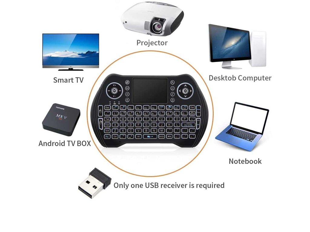Široka uporaba koju nudi ova jedinstvena, praktična i kompaktna bežična mini tipkovnica za TV također je moguća zahvaljujući vrlo dobroj kompatibilnosti uređaja: