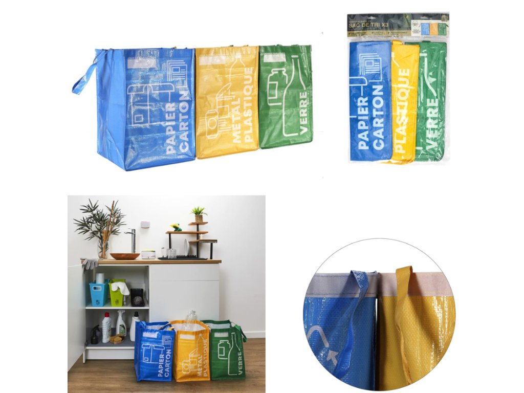 Ove praktične vrećice za odvojeni otpad sastoje se od 3 košare različite boje izrađene od netkanog materijala. Spremnik sa žutim otvorom je za bacanje plastike, zeleni za staklo, a plavi za papir, kartonske kutije ili npr. uredski otpad.
