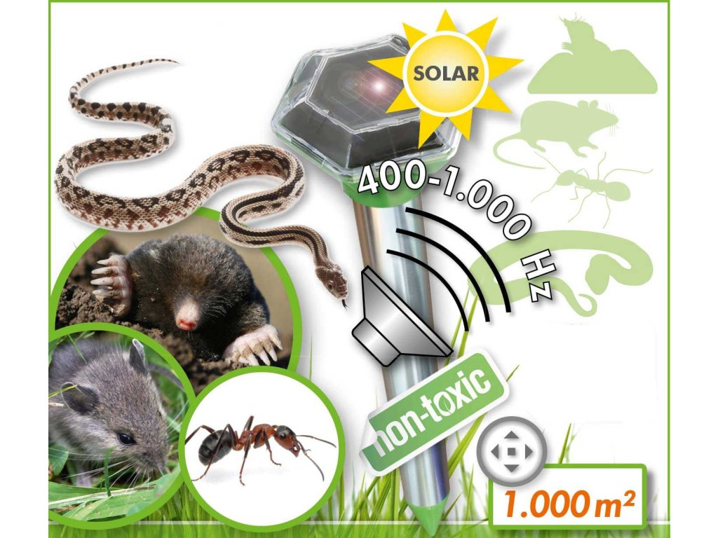 Primjena ovog solarnog repelenta iznimno je široka. Možete ga koristiti u borbi protiv zmija, mrava, krtica, miševa, štakora i ostalih glodavaca. Učinkovit je i protiv kuna ili ptica do 10 m. Idealno za zaštitu vaših usjeva. Sve te životinje osjetljive su na niz vibracija s promjenjivom frekvencijom od 400 do 1000 Hz. Istraživanja su potvrdila učinkovitost uređaja na površini do 1000 m2.