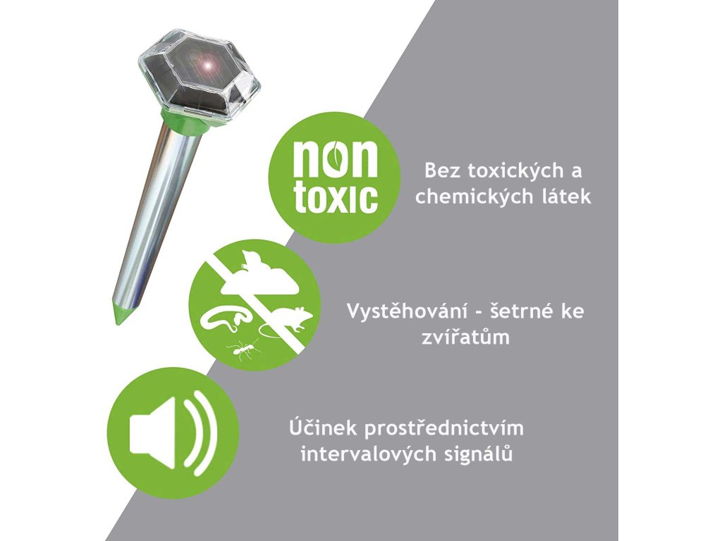 Kada se umetne u tlo, odbijač emitira vibracije promjenjive frekvencije od 400 do 1000 Hz. Signali utječu na živčani sustav zmija, mrava, krtica i glodavaca. Izazivaju strah, tjeskobu i neorijentaciju na terenu. Nakon nekoliko dana, štetnici će napustiti ovo područje. Vibracije se emitiraju u pravilnim intervalima i zbog promjenjivog raspona životinje se ne mogu naviknuti na njih. Uređaj je dopunjen tehnologijom LED FLASH svjetla, koja će pomoći u zaštiti zaštićenog područja noću.