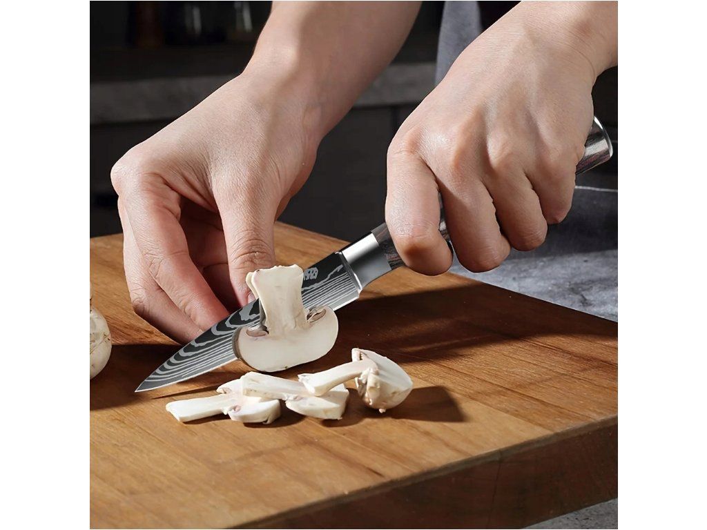 Svaki nož je prekrasno ukrašen laserom koji stvara dojam damaščanskog čelika i daje noževima ekskluzivan izgled. Ovaj ukras ne samo da povećava estetsku vrijednost noževa, već ih čini i umjetničkim djelom koje će ukrasiti vašu kuhinju.