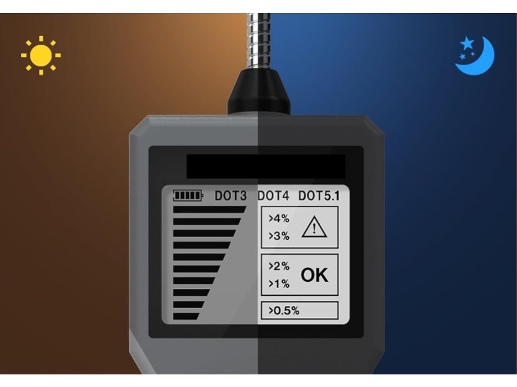 Jedinstveni tester kočione tekućine kompatibilan je s najčešćim vrstama tekućina – DOT3, DOT4 i DOT5.1. Zahvaljujući mogućnosti jednostavnog prebacivanja između vrsta, uređaj može pružiti točne i relevantne rezultate za određenu tekućinu koju testirate. To vam omogućuje maksimalnu sigurnost vašeg vozila.