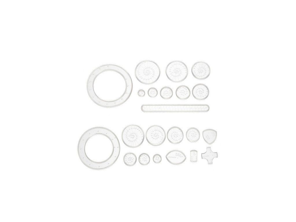 - veliki kružni kotač i 7 manjih kotača s različitim rupama i geometrijskim predlošcima za stvaranje raznih oblika, poput elipse, pravokutnika ili trokuta