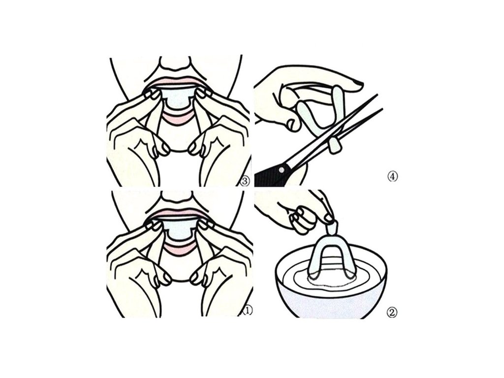 Prokuhajte vodu i ulijte u staklenu posudu. Kada se voda ohladi na oko 70°C, stavite udlagu u posudu s vodom. Nakon otprilike 20-30 sekundi izvucite udlagu, stavite je na zube i čvrsto zagrizite. Nakon 1-2 minute izvadite udlagu iz usta i stavite je u hladnu vodu na 2-3 minute. Udlaga je spremna za upotrebu. Ako je udlaga prevelika, možete je rezati škarama.