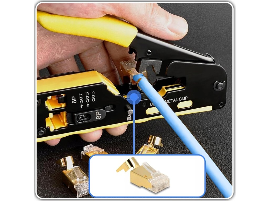 Ovaj visokokvalitetni alat dizajniran je za krimpovanje CAT.5e i CAT.6 modularnih konektora, koji se često koriste u internetskim i podatkovnim mrežama. Zahvaljujući 8P i 6P pinovima, precizno i pouzdano rukuje najčešćim tipovima konektora.